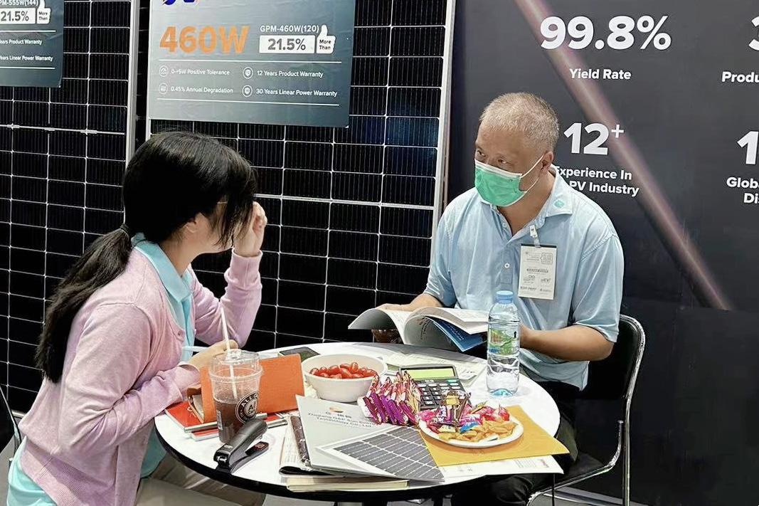 格普光能早已深耕泰国市场多年,以产品的高效能、可靠性以及优质的服务获得了泰国广大客户的认可。本次展会格普光能结合当地市场需求和政策携P型460W、555W组件以及TOPCon 580W组件等明星产品亮相,吸引了广大客户驻足交流。